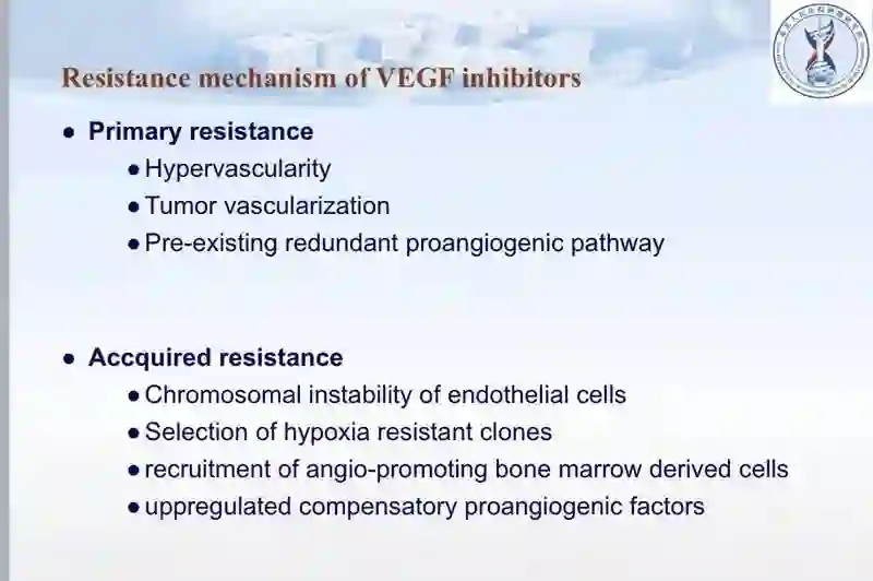 (1)原发性耐药机制:血管生成过多;肿瘤血管化;已存在有其他的促血管生成的通路。