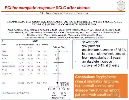 许教授分别跟大家介绍了化疗后疾病缓解局限期小细胞肺癌脑预防性放疗的作用;完全切除术后小细胞肺癌脑预防性放疗的作用;化疗后疾病缓解广泛期小细胞肺癌脑预防性放疗的作用。同时还分析了脑预防性放疗后的患者发生脑转移再程行脑部放疗的疗效及毒副反应。对非小细胞肺癌脑预防性放疗的作用也进行了阐述,局部晚期患者若治疗后疾病无进展,脑部预防性放疗可降低脑转移的发生,但对患者总生存无显著性影响,需要行进一步的随机临床试验明确其作用。