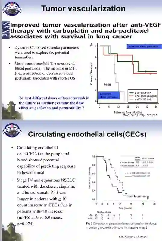 (2)与免疫治疗联合。IMPOWER150的研究结果提示Atezolizumab联合贝伐单抗和化疗组较贝伐单抗联合化疗组显著延长了患者PFS,特别是在驱动基因阳性(EGFR/ALK+)以及肝转移患者中也看到了显著良好获益。在抗血管生成治疗生物标志物方面的探索从未停止。近期有研究提示,CT上的血管影像参数、平均通过时间(Mean transit time,MTT)、循环内皮细胞(Circulating endothelial cells, CECs)等有可能成为抗血管治疗在肺癌中应用的潜在标志物,然而这些发现仍需要在大样本临床研究中进一步验证。尽管目前并没有成熟的可以在临床应用的抗血管生成治疗疗效预测分子生物标志,但是探索有效的生物标志物仍然是进一步提高抗血管治疗疗效的关键所在。