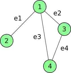下面的矩阵表示的就是上方的图,其中竖列是边,横排是节点。竖列中的1表示顶点{1, 2}的关联边e1,e2是{1, 3}的关联边,以此类推。