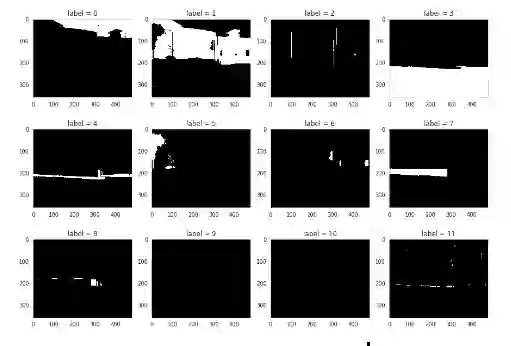 将原始图像作为ground truth。对于任何算法,总是在与ground truth数据的比较中进行指标的评估。在数据集和测试集中提供ground truth信息用于训练和测试。对于语义分割问题,ground truth包括图像、图像中目标的类别以及针对特定图像中每个目标的分割掩模。对于图2中的12个类别,这些图像分别以二进制格式显示: