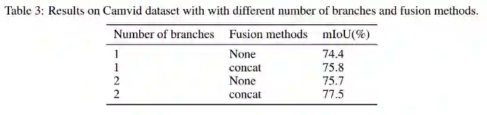 模型架构中使用的分支数和融合方法对IOU的影响如表3所示。