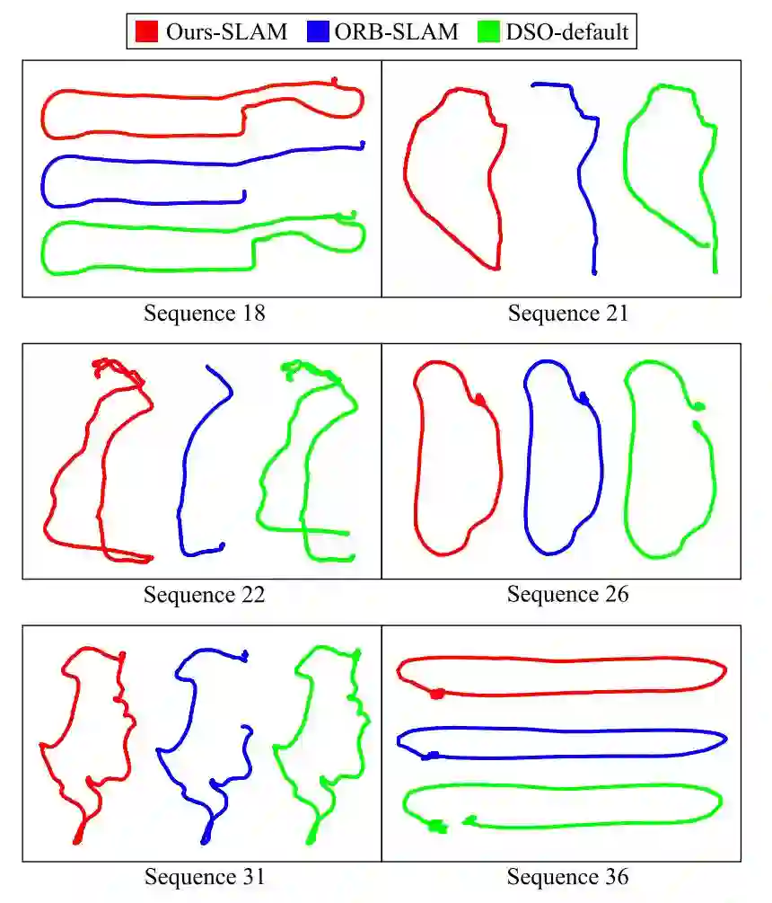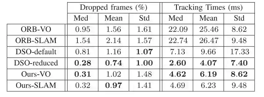 - Ours-VO和Ours-SLAM:VO设定采用DSO-reduced和ORB-VO,而SLAM设定采用DSO-reduced和ORB-SLAM。