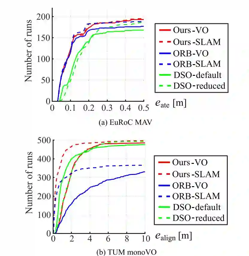 图2 累计误差曲线图(a)绝对轨迹误差e_ate [m],包括EuRoC MAV所有数据序列,(b)对齐误差e_align [m],包括TUM mono VO所有数据序列。曲线距离Y轴越近,精度越准确,因为这表示多次运行后还能保持低误差。曲线末端距离X轴越远,系统越鲁棒,因为这表示没有跟踪失败的运行次数更多。