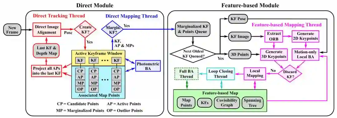 本文提出一种新颖的针对单目SLAM的半直接方案,继承了基于直接法的视觉里程计的鲁棒性和基于特征点法的SLAM的地图复用能力(比如:回环检测)。贡献主要是直接法和特征点法的松耦合形式,主要包括: