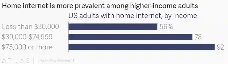 2019年,从接受调查的美国成年人来看,92%使用家庭互联网的成人年收入超过7.5万美元,而其中有56%的人年收入低于3万美元。