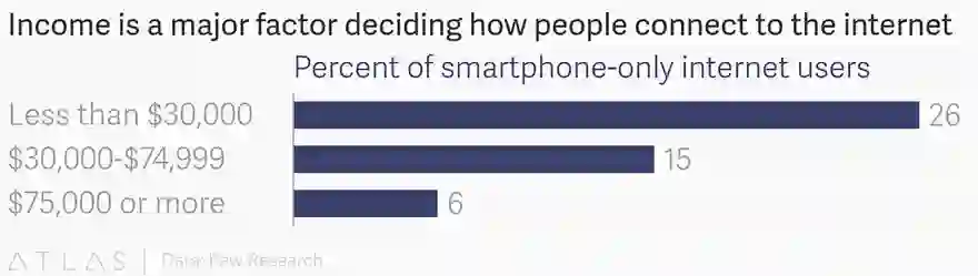 今年,在收入低于3万美元的美国成年人中,有26%的人表示自己是“单一智能手机”互联网用户。