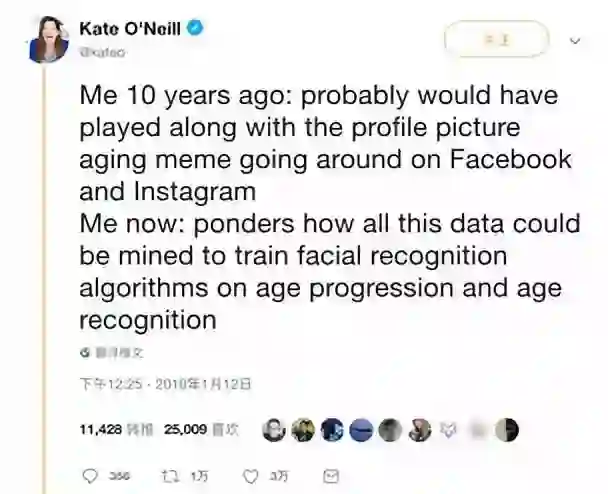KO Insights的创始人,Kate O'Neill并没有参加“十年挑战”,而是发布了以下略带讽刺的推文: