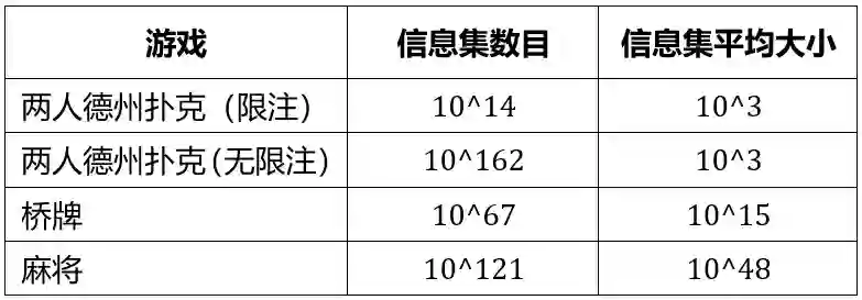 对于不完美信息游戏,我们仍然可以同完美信息游戏一样计算其状态空间复杂度和游戏树复杂度。然而,在不完美信息游戏中,由于信息是不完全、非对称的(例如扑克和麻将中对手的手牌和游戏剩余的底牌都是未知的),因此对于参与者来说许多不同的游戏状态看起来是无法区分的。例如在扑克游戏中,自己拿了两张 K,对方拿了不同的牌对应不同的状态;但是从自己的视角看,这些状态其实是不可区分的。我们把每组这种无法区分的游戏状态称为一个信息集。 显然,对于不完美信息游戏而言,合理的游戏策略应该建立在信息集而不是游戏状态之上,因为我们依赖未知信息来细粒度出招是没有意义的。相应地,当我们衡量不完美信息游戏的难度的时候,也应该依据信息集的数目,而不是游戏状态空间的大小。信息集的数目通常小于状态空间的数目。对于完美信息游戏,由于所有信息都是已知的,每个信息集只包含一个游戏状态,因此它的信息集数目与状态空间数目是相等的。 除了信息集的数目,还有一个重要的指标:信息集的平均大小,即在信息集中平均有多少不可区分的游戏状态。以两人德州扑克为例,假定我们的手牌是 AA,考虑对手的手牌为 AK 或者 AQ 两种不同情况。因为信息不完全,我们无法区分当前局势到底处在哪个状态,因此会把两种情况都归到同一个信息集。在两人德州扑克中,信息集的大小最多为1326(从52张牌中选择2张:C_52^2),也就是约为10^3。容易看出,信息集的数目反映了不完美信息游戏中所有可能的决策节点的数目,而信息集的平均大小则反映了游戏中每个局面背后隐藏信息的数量。显然,信息集平均大小越大,其中包含的未知信息就越多,因此决策的难度就越高。事实上,信息集的平均大小直接影响采用搜索算法的可行性:当对手的隐藏状态非常多时,传统的搜索算法基本上是无从下手的。因此信息集的平均大小也可以作为游戏难度的衡量指标。 表2:不完美信息游戏的信息集数目和信息集平均大小无限注德州扑克的信息集数目很大,但是因为只有两张不可见的牌,其隐藏信息很少,信息集的平均大小很小。桥牌和麻将由于是每个玩家手里可以有13张未知的手牌,因此隐藏信息的数量远远超过了德州扑克。表2给出了德州扑克、桥牌和麻将的信息集数目和信息集的平均大小。 如果我们以信息集数目和信息集平均大小为准则,来对比像围棋这样的完美信息游戏和表2中的几种不完美信息游戏,会得到非常有意思的结果。如图3所示,围棋和德州扑克的信息集平均大小远远小于桥牌和麻将。AI 在围棋和德州扑克上的成功很大程度依赖于搜索算法,因为搜索可以最大程度地发挥计算机的计算优势。但是因为巨大的信息集平均大小带来的环境不确定性,传统的搜索算法在桥牌和麻将面前很难发挥同样的功效。 图3:围棋、德州扑克、桥牌和麻将的信息集数目和信息集平均大小对比 回顾游戏 AI 的历史,目前大部分完美信息游戏(如国际象棋、围棋等)以及信息集平均大小较小的不完美信息游戏(如两人德州扑克和多人德州扑克等)都有了相当好的解决方法。然而,对于桥牌和麻将这类含有大量隐藏信息的不完美信息游戏,需要我们发明全新的方法论,才能有所突破,而这需要 AI 算法的研究者们持之以恒地探索。