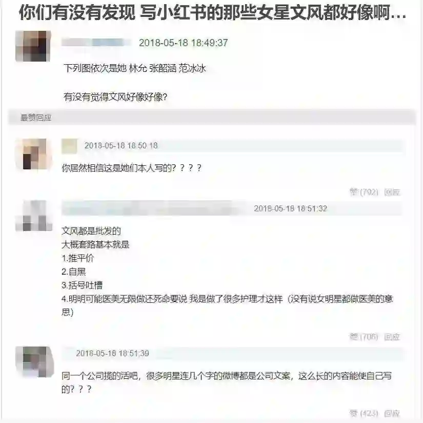 有小红书用户对虎嗅反应,会有疑似“水军”的用户在小红书里引导舆论,而质疑广告的评论会遭删除。此外,在小红书之外,也早已出现对明星广告的议论。