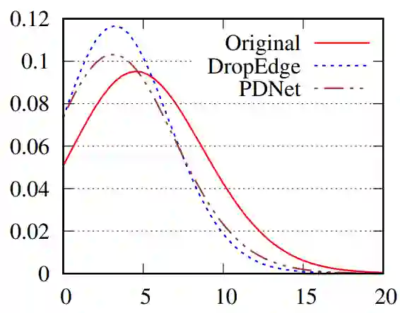 相似的,作者也验证了PTDNet是否会对本身是否会滤除有重要贡献的边。作者构建了一个模拟数据,这个模拟数据里正边指同样标签的节点连接,否则负边。同时,作者考虑探讨了这种drop方法是否会对图本身拓扑结构信息,如度数分别产生影响: