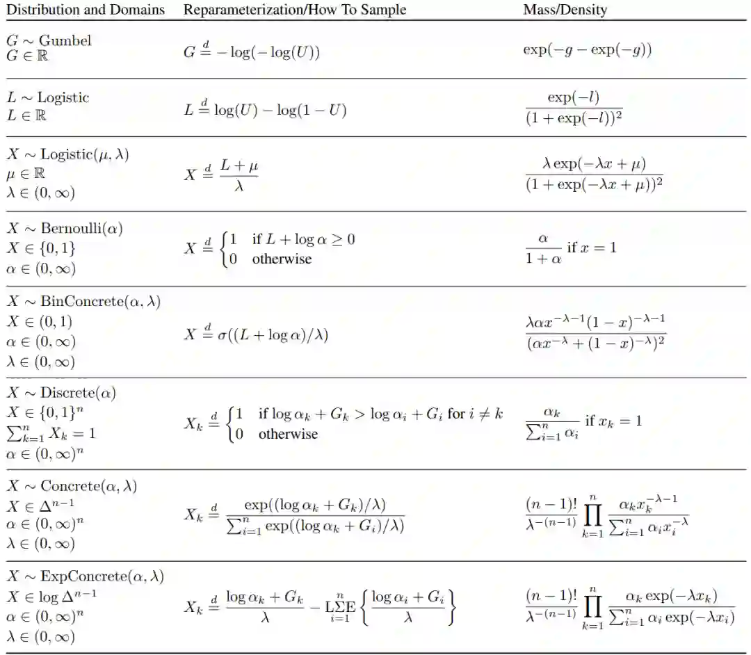表示统计函数( cumulative distribution function, CDF),根据CDF可以得到对 的微分结果:(PS: 对于所有分布的重参数采样后的结果来源于SCG[1]中的,且作者是给了一个很大的表可以用作参考,L指Logistic 函数。)