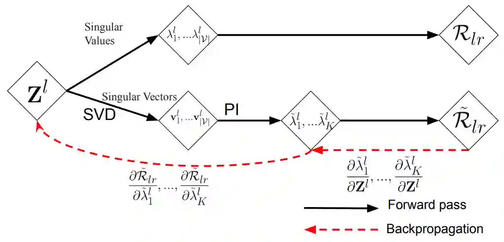 表示这个邻接矩阵 层的最大特征值。一般求解特征值的方法有两种,一种是SVD方法解,一种是用迭代式方式解,但SVD解得的特征值可能导致反传函数不稳定的情况,而迭代式可能输出不准确的近似值,并且当特征值接近零的时候更不准确了,会有较大波动,不易收敛。因此,基于以上分析,作者结合了这两种方法直接对mask进行分解,用SVD的特征向量初始化替代迭代法中的随机初始,如图所示: