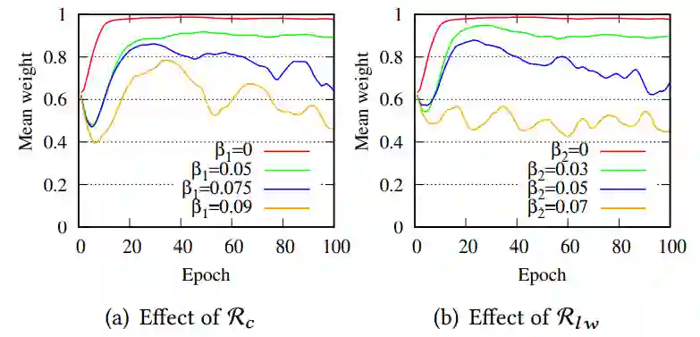 纵坐标表示占比,可以发现使用PTDNet之后的度分布曲线与原始分布比较接近,而DropEdge的形态改变比较明显(这个图有一点小typo,但是不影响阅读)。之后,可以看一下两个约束项对模型有多大影响: