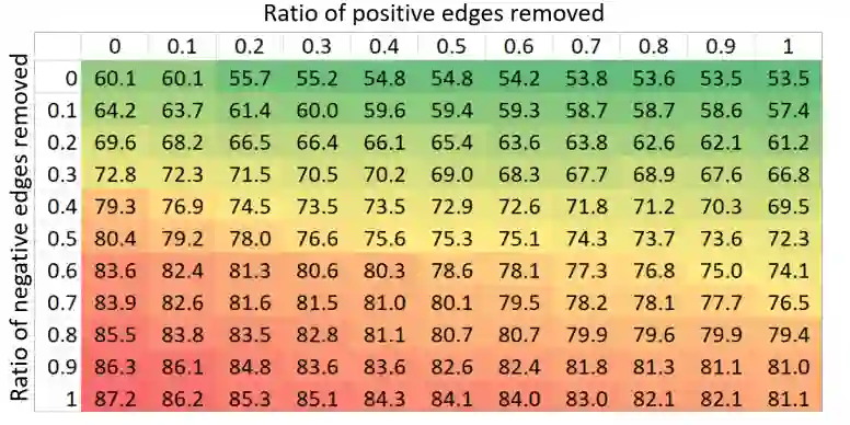 GNN 模型通常是根据拓扑结构,利用节点特征构建消息传递过程。然而,并不是所有的节点都需要参与消息传递过程,因此,需要一种选择的方法来刻画哪些边上的消息传递是真正需要的,也就是对边信息进行去噪。作者首先给出了一个GCN在Cora上的实验小例子,这个实验将相同标签的节点连接成正边,否则为负,对这些边进行随机移除,发现负边的移除会使得模型准确率上升: