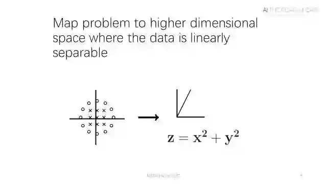 现在的问题就是,有多少状态是可以进行线性分割?实际上这个数量并不多。这时我们就需要把这些数据映射到更高维的空间,然后再来解决这个问题。我给一个简单的例子来向大家展示一下我们怎么样实现映射。原始的数据是二维的,我把它称为X&Y,现在我要做的就是要把这个数据映射到一个三维的空间。我有一个Z轴,而Z轴的值将会是X平方加上Y平方,它可以实现的就是把一些元素从平面上拿出来变成立体的,这样你就可以看到这些数据可以用一个跟之前平面平行的平面来进行分割。这是一个非常简单的例子,但是它就是我们所谓的支持向量机的工作原理。