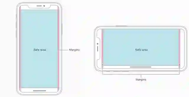 对于使用自定义布局的应用,如果想要适配 iPhone X 也比较容易,特别是当应用使用了响应式布局(Auto Layout)时,请参考下方提供的安全区和边距布局规范。