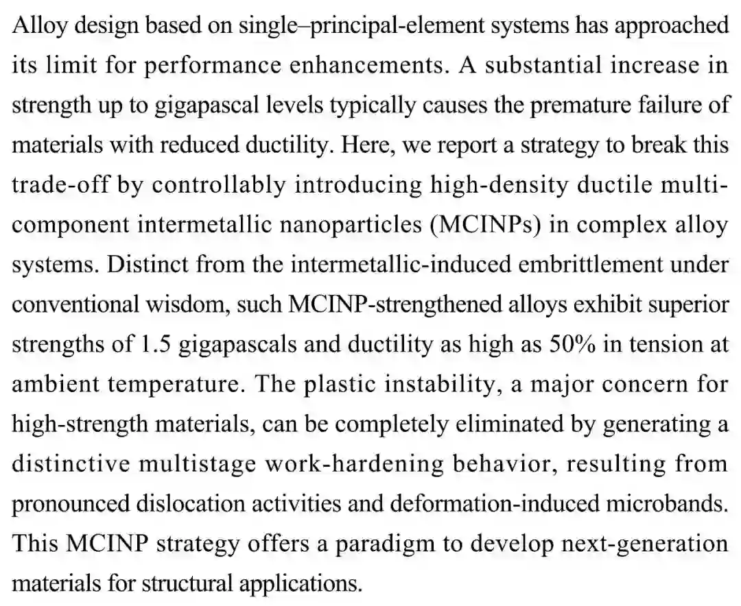 (导读 卓思琪)以单一元素为主的合金在强度和延展性上难以两全。将基质材料的强度提高到吉帕斯卡水平会降低延展性。本研究在合金中可控地引入高密度延展性多组分金属间纳米粒子,打破强度和延展性之间的此消彼长。所得到的材料在室温下具有高达1.5吉帕斯卡的强度,而延展度达到50%。该策略为发展次时代结构材料提供了范例。
