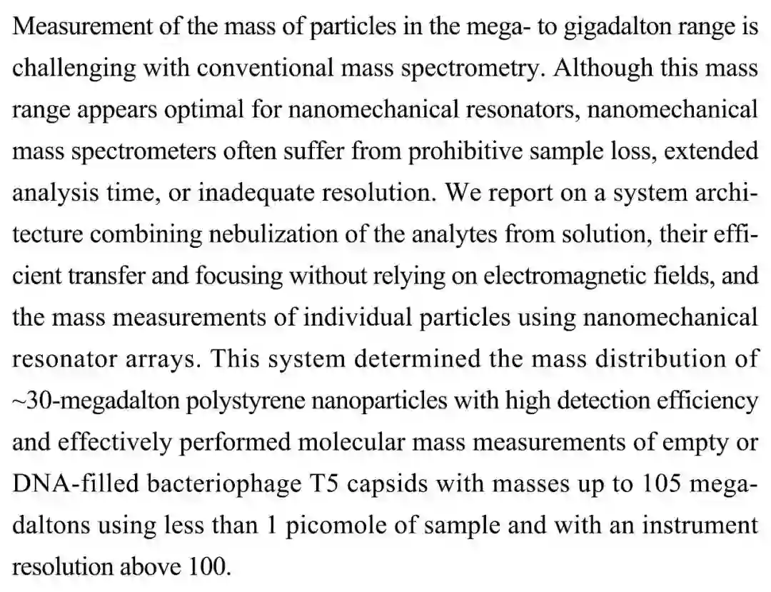 (导读:陈欣桐)传统的质谱仪和纳米机械振子质谱仪在测定生物大分子的质量时均表现出不足。本文提出了一种新的分析方法,其包括三个步骤:待测物的雾化、不依赖电磁场的传输与聚焦、使用纳米机械振子序列对单个粒子进行质量检测,并有效测定了聚苯乙烯纳米颗粒(低于30MDa)、T5噬菌体衣壳(105MDa)及其空衣壳的质量。