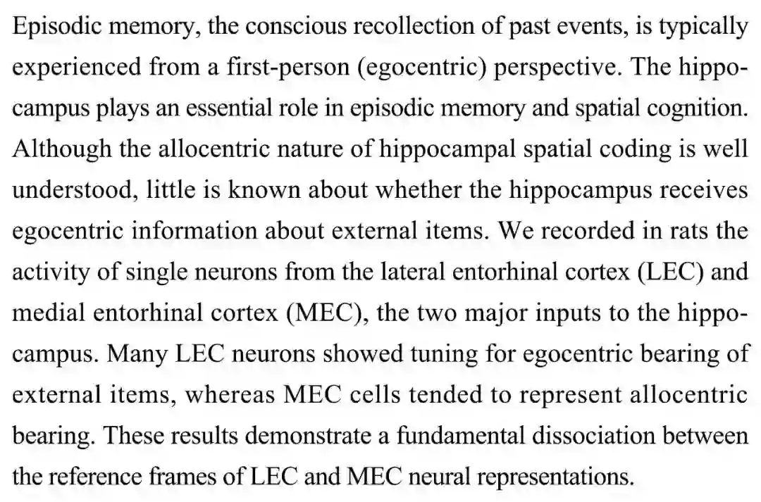 (导读 刘奇)海马体以异我中心方式处理空间感知信息,但它是否以自我中心(第一人称)方式进行外部事件记忆尚不明确。本研究通过实验记录了大鼠外侧内嗅皮质(LEC)和内侧内嗅皮质(MEC)单个神经元的活动,发现作为海马体的两个主要信息输入脑区,LEC和MEC的工作模式不同:LEC以自我中心方式处理外部信息,而MEC以异我中心方式工作。