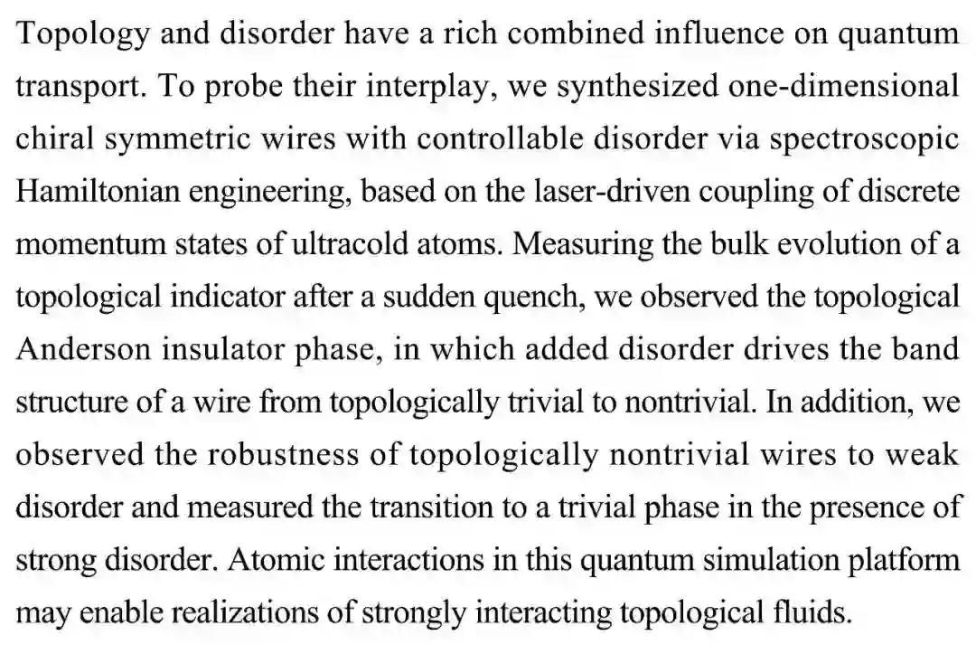 (导读 阿金)拓扑性和无序性会共同影响量子输运。基于激光驱动超冷原子离散动量态的耦合,本研究合成了一种具有可控无序性的一维手性对称原子线。在突然淬火后测量拓扑指示器的变化观察到拓扑安德森绝缘体相,增加的无序性使得原子线能带从拓扑平庸过渡到非平庸。研究结果有助于实现强互作用的拓扑流体。