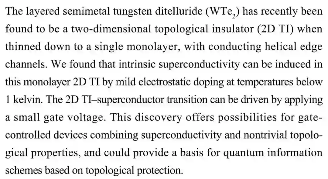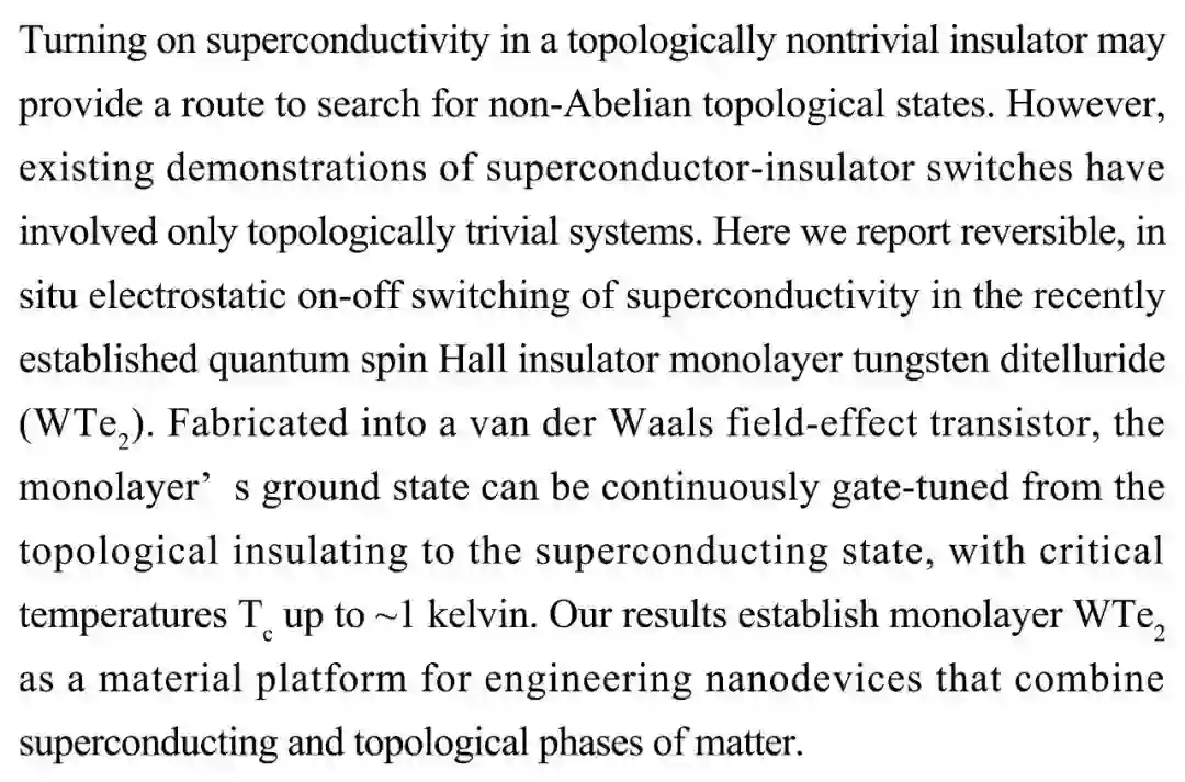 (导读 阿金)现存的超导体-绝缘体的开关仅限于拓扑平庸系统。本研究在量子自旋霍尔绝缘体单层二碲化钨中实现超导性的可逆原位开关转换,在临界温度高达1开尔文的情况下通过栅极谐调可连续进行绝缘体-超导体转变。该结果证明单层二碲化钨可作为结合物质超导相与拓朴相的材料平台。