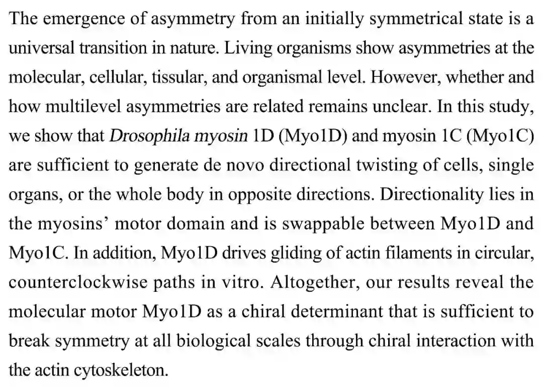 (导读 郭怿暄)生物在分子、细胞、组织及整体存在多层次非对称性,但相互间关系尚不清楚。本研究发现果蝇中肌球蛋白1D(Myo1D)和肌球蛋白1C(Myo1C)是从头产生细胞、单个器官方向性扭转以及整个身体相反方向生长的充分条件。方向性位于肌球蛋白马达结构域,在Myo1D和Myo1C中可互换。体外Myo1D可驱动肌动蛋白纤维沿环形逆时针滑动。该发现揭示了生物体多层次手性决定因子。