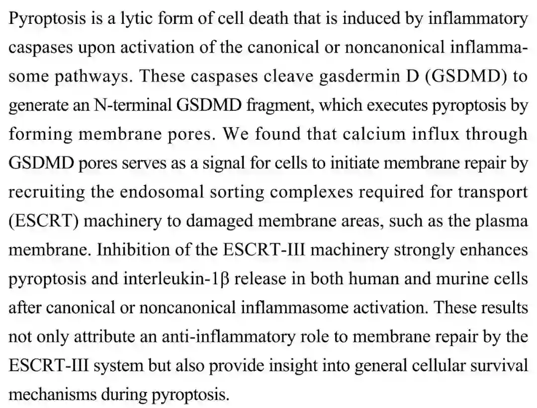 (导读 柳寒石)细胞焦亡(Pyroptosis)是细胞死亡的裂解形式,由炎性半胱天冬酶在经典或非经典炎症小体途径激活后诱导发生。本研究发现通过GSDMD孔隙的钙流是募集内吞体分选转运复合体(ESCRT)至膜受损区域以启动膜修复的信号。 在经典或非经典炎性小体激活后,抑制ESCRT-III显著增强人和小鼠细胞焦亡及IL-1β的释放。研究结果不仅发现ESCRT-III在膜修复中的抗炎症功能,还增加对细胞于焦亡期间存活机制的了解。