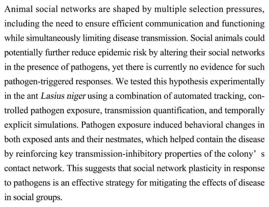 (导读 阿金)动物社交网络由多种选择性压力形成,面对病原体时,社会性动物可能通过改变社交网络减少疾病风险。本研究集合自动跟踪、可控病原体暴露、疾病传播量化和时间显示模型,在黑褐毛山蚁(Lasius niger)中发现病原体暴露诱发了蚂蚁及其同伴的行为变化,通过加强群落联系网络的疾病传播-抑制关键属性协助控制了疾病。
