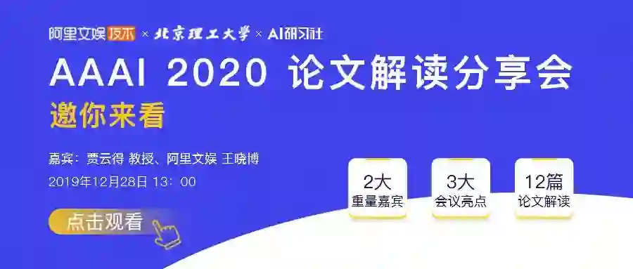 为更好贯彻“连接AI学术与企业界”的目标,AI研习社携手阿里文娱与北京理工大学,将于2019年12月28日在北京阿里中心望京B座召开“AAAI 2020 论文解读分享会”,虽然美国很远,望京很近,但是我就不在北京?所以我们将通过直播的方式,让更多对AAAI感兴趣的同学和老师能够参与其中,欢迎大家积极报名,积极转发!