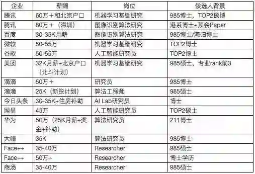 里面的雇主从国外的微软、谷歌到中国的BAT,全都是科技巨头。年薪最高的岗位是谷歌中国的人工智能工程师,达到56万人民币,一些算法工程师也是30万起步。