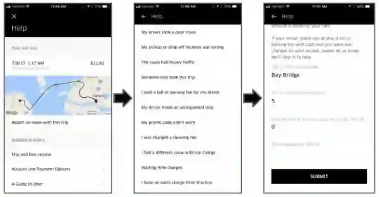 图 1:Uber 内置的客户支持服务为用户提供了一个直观且易于使用的界面,先提供问题可能的类型,然后突出显示行程的细节