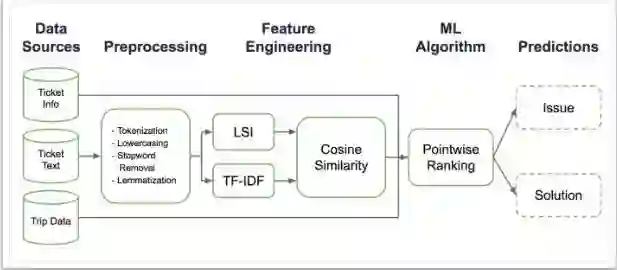 图 3:为识别工单问题类型和选择解决方案,我们建立的 NLP「管道」模型由三个不同的步骤组成:预处理,特征工程和基于点的排序算法。