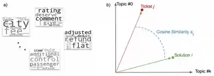 图 4(a)主题建模:我们使用 TF-IDF 和 LSA 从文本数据中提取主题;( b)特征工程:将所有工单解决方案和工单问题映射到主题向量空间,计算解决方案和工单之间的余弦相似度