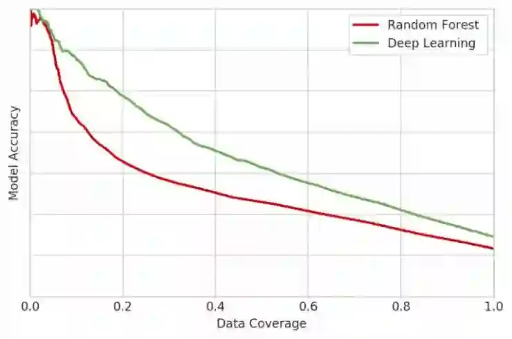 在下图中,我们展示了工单集的数据覆盖率(模型正在处理的工单百分比,x 轴)和准确度(y 轴)之间的关系。如下所示,随着数据覆盖率的降低,两种模型都变得更加精确,但是我们的深度学习模型在相同的数据覆盖率上表现出更高的准确性,在相同准确度下表现出更高的数据覆盖率。
