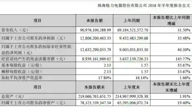 昨日,格力电器发布半年报,营业收入909.8亿元,同比增长31.5%;净利润128亿元,同比增长35.48%。