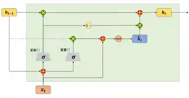 的值为1时,GRU网络中的更新门和重置门就不再发挥作用了,而此时的GRU网络就退化成了简单循环神经网络,因为此时有: