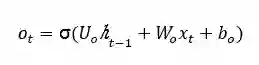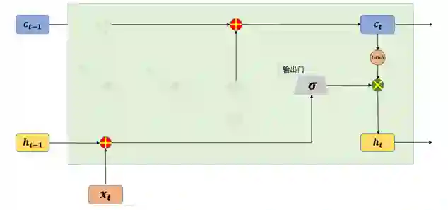 和输入门是同样的方法,通过的值来控制上一时刻的内部状态有多少信息需要“遗忘”。当的值越趋近于0,被遗忘的信息越多。同样的原理,我们来看“输出门”,如图4所示。输出门的计算公式如下: