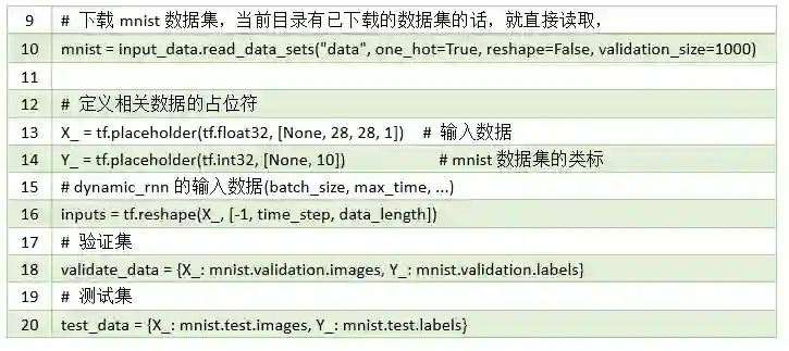 第10行代码用来加载mnist数据集,并通过参数“validation_size”指定了验证集的大小。第16行代码用来将mnist数据集的格式转换成“dynamic_rnn”函数接受的数据格式“[batch_size, max_time,data_length]”。