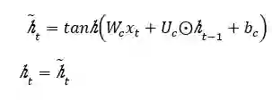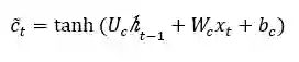 上式中,参数的下标“c”代表这是“tanh”节点的参数,同理,输入门参数的下标为“i”,输出门参数的下标为“o”,遗忘门参数的下标为“f”。上式与简单结构循环神经网络中隐藏层的计算公式一样。在LSTM中,我们将“tanh”节点的输出称为候选状态。