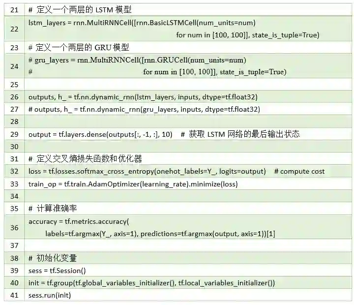 TensorFlow中实现LSTM和GRU的切换非常简单,在上面的代码中,将第22和26行代码注释掉,然后取消第24和27行代码的注释,实现的就是GRU。
