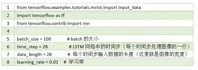 我们首先导入需要的包,然后定义了神经网络中的一些相关参数。其中第6行代码定义了LSTM中的时间步的长度,由于我们mnist数据集的图像大小为28X28,所以我们将一行像素作为一个输入,这样我们就需要有28个时间步。第7行代码定义了每个时间步输入数据的长度(每个时间步的输入是一个向量),即一行像素的长度。