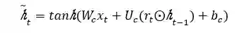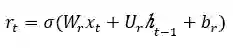 重置门的作用是决定当前时刻的候选状态是否需要依赖上一时刻的网络状态以及需要依赖多少。从图5可以看到,上一时刻的网络状态先和重置门的输出相乘之后,再作为参数用于计算当前时刻的候选状态。重置门的计算公式如下: