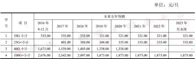 (光模块产品销售均价预测,资料来源:中际旭创公告)