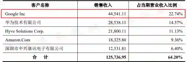 2016年,旭创实现营收19.55亿元,其中对谷歌的销售收入为4.45亿元,占比达到22.74%。