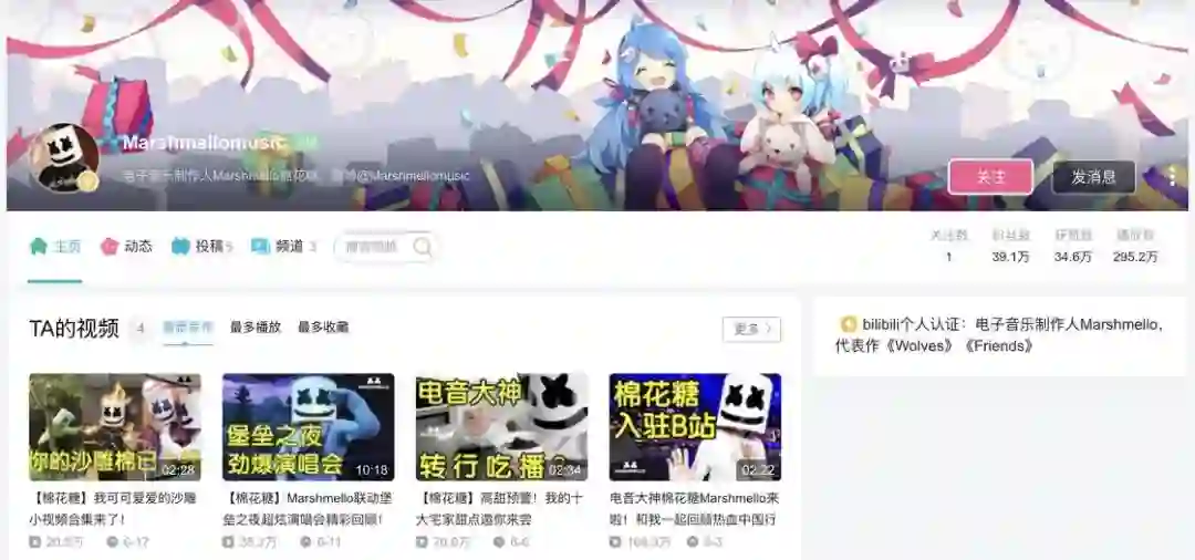 虽然入驻时间不长,但 Marshemello 在 B 站上的粉丝数也已经达到 39 万。如果你错过了他之前在游戏《堡垒之夜》里开的线上演唱会,也可以在他的 B 站投稿中回顾。对了,同为电子音乐制作人的 Alan Walker 也有自己的 B 站账号,作为电音爱好者的你,怎么能错过这两个大神级的制作人。