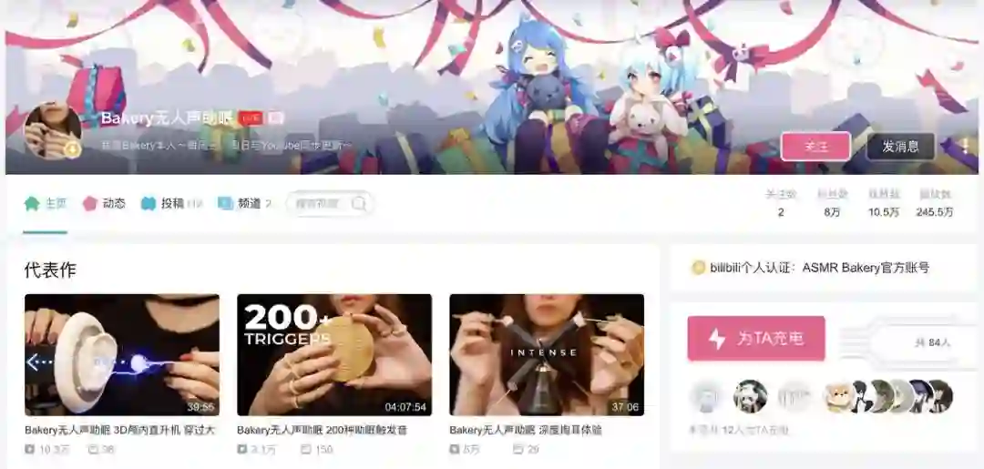 对于不清楚触发音喜好的观众,Bakery 也提供了一段长达 4 小时,共计 200+ 种触发音的视频。此外,频道中还有不少 B 站首发的助眠声可供聆听。