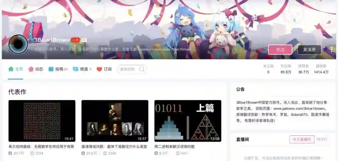 3Blue1Brown 是一个数学知识科普频道,其创始人 Grant Sanderson 曾于 2015 年取得了斯坦福大学数学学士学位。3Blue1Brown 视频的特点就在于通过动画的方式来展现数学之美,用简单直观的方式来介绍那些晦涩难懂的知识。