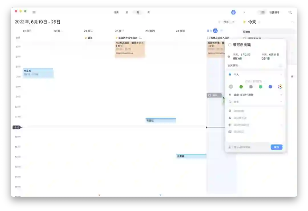 针对状态为「随时」的待办,可以在弹出的详情浮窗中对其进行具体的设置,但它作为待办任务没有「持续时间」属性,只能设置提醒时间。如果我把待办任务拖到时间线上的对应位置,那么它就拥有了开始时间和结束时间,状态变为了「已安排」,可以看作一个能勾选完成的「待办日历事件」。