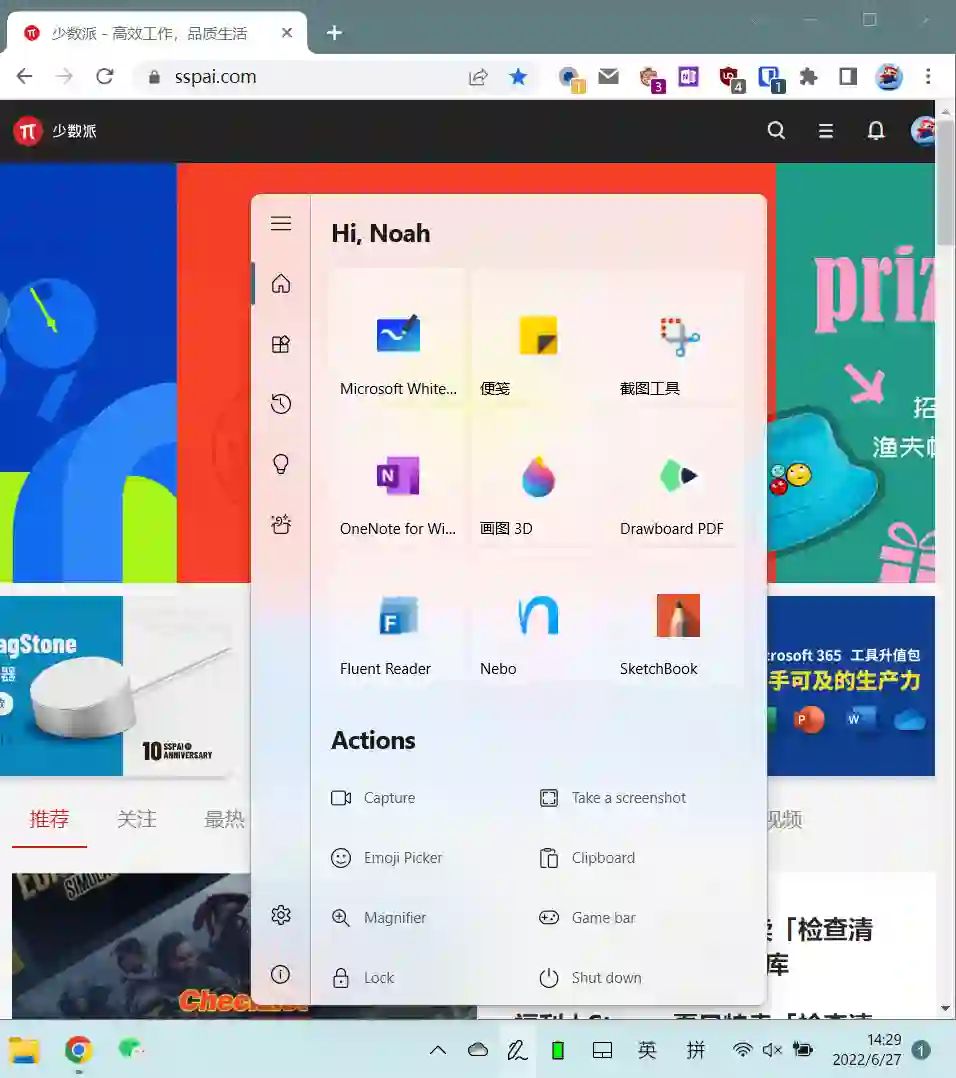 相比系统内建的 Windows Ink 工作区,Ink Workspace 的功能可以说是「武装到牙齿」了。它将功能区域分成了多个标签,俨然像是一个开始菜单迷你版。与原生 Windows Ink 一样,单击托盘图标即可弹出悬浮菜单,菜单主页展示了应用快捷方式和快速操作按钮。